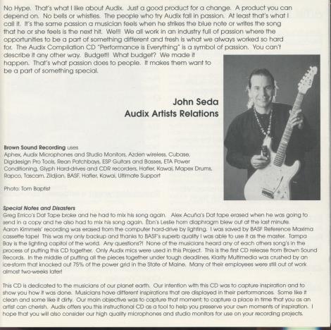 Audix offers you this instructional CD as way to help you preserve your own moments of inspiration. I hope that you will also consider our high quality microphones and studio monitors for use on your recording projects.