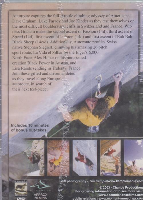 Witness Graham make the second ascent of Passion (14d), third ascent of Speed (14d), first ascent of la Loon (14d), and first ascent of Bah Bah Black Sheep (14c/d). Additionally, Autoroute profiles Swiss native Stephan Siegrist, climbing his amazing 26 pitch sport route, La Vida el Silbar on the Eiger's 6,000' North Face, Alex Huber on his unrepeated creation Black Power in Austria, and Lisa Rands sending in Tralenta, France.