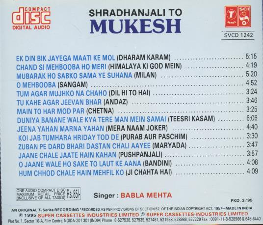 BABLA MEHTA pays tribute to the legendary singer Mukesh with soulful renditions of classic Bollywood songs. An original T-Series recording. Made in India. © 1995 Super Cassettes Industries Limited.