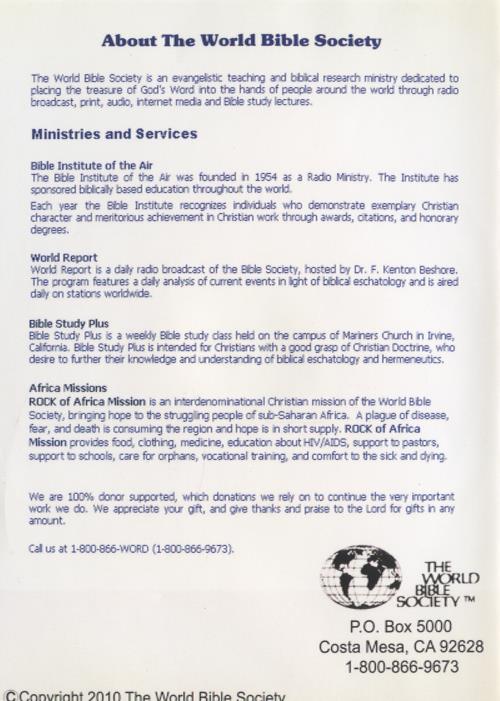 The World Bible Society is an evangelistic teaching and biblical research ministry dedicated to helping God's end time servants throughout the world through radio broadcast, print, audio, internet media, and Bible study lectures.