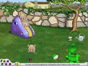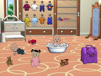 The many other symbols connected to the house give you egress to rooms where your Babyz can sleep, be maintained (dressed, bathed, changed [G-rated], given medical attention, play with toys, learn listen to records, and get fed). You can take the Babyz into the backyard to play, take their pictures, and teach them to talk. Babyz start out at about the age of six months crawling on their tummies and then progress to regular crawling and eventually walking and toddling. They grow to about 15 to 18 months. You can also use Babyz as a screensaver and let your Babyz play on the computer desktop.