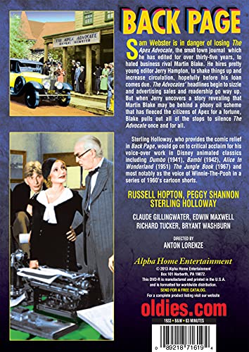 Sam Webster is in danger of losing The Apex Advocate, the small town journal which he has edited for over thirty-five years, to hated business rival Martin Blake. He hires pretty young editor Jerry Hampton, to shake things up and increase circulation, hopefully before his loan comes due. The Advocates' headlines begin to sizzle and advertising sales and readership go way up. But when Jerry uncovers a story revealing that Martin Blake may be behind a phony oil scheme that has fleeced the citizens of Apex for a fortune, Blake pulls out all of the stops to silence The Advocate once and for all. Sterling Holloway, who provides the comic relief in Back Page, would go on to critical acclaim for his voice-over work in Disney animated classics including Dumho (1941), Bambi (1942), Alice In Wonderland (1951) The Jungle Book (1967) and most notably as the voice of Winnie-The-Pooh in a series of 1960's cartoon shorts.