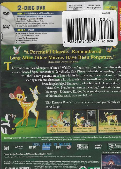 In Disney's spectacularly animated forest fable, a fawn named Bambi is born, destined to become "Prince of the Forest." He soon befriends other woodland creatures such as Flower, a bashful skunk, and Thumper, an outgoing rabbit. As the years pass, they encounter a number of life's lessons in the woods, including the death of Bambi's mother at the hands of hunters. Eventually, Bambi comes of age, completing the cycle of life and taking his father's place.Based on the classic novel by Felix Salten, BAMBI demonstrates the strength of family values and camaraderie. Director David Hand adds a mixture of great songs and life-like backgrounds to make this early Disney film an unforgettable style="font-size: 14px;" film classic for all ages.