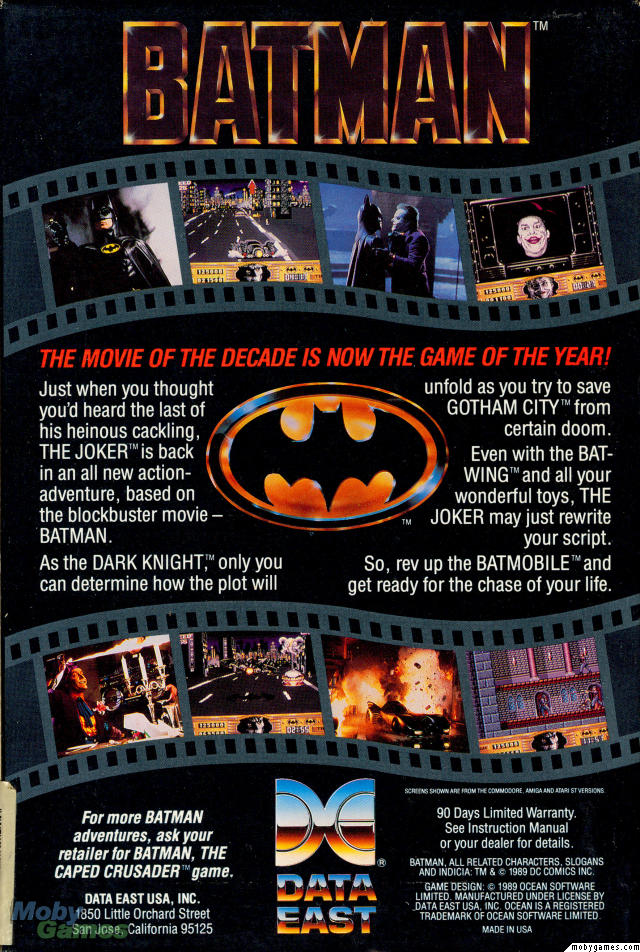 Based on the 1989-Batman movie. The game consists of five different parts, each resembling well known game types. Part one, the chemical plant: Hunt down Jack Napier who has raided the plant (typical platform action, climb ladders or use "Bat"-rope and shoot at some enemies...). Part two, "Batmobile" (...the car): Joker is chasing you and have to escape to "Bat"-cave. Avoid obstacles like police blocking the road and others. Part three, "Bat"-cave: A puzzle game where you have to find a certain item (belonging to Joker) amongst other items. Part four, "Batjet": Cut the ropes of the balloons which are filled with poisonous gas. Part five, the cathedral: Hunt down Joker. This part plays like the first one. Finally you will confront Joker in a fight that decides the fate of Gotham city.