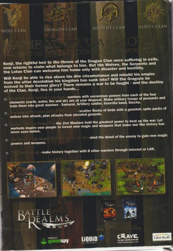 Guide the fate of Kenji, heir to the fallen Serpent Empire, who, having returned to his homeland after a seven-year exile, must now make a choice whether to subjugate or liberate his feuding land. Standing against him are the wild, untamed Wolf Clan and the malignant Lotus Clan in a world that is visually alive -- a place where peasants go about their daily tasks, and time marches on around you regardless of your actions. A wise sensei smokes his pipe outside the dojo while warriors train inside, birds nestle and fly among the trees and just down the road, a geisha bathes in a hot spring outside her home. In Battle Realms ninjas vanish in clouds of smoke, monks leap to impossible heights, and Zen archers can hit sparrows from across the battlefield while blindfolded.