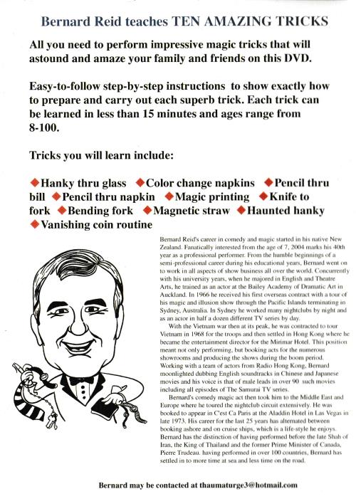 *Hanky thru glass ♦Color change napkins ♦Pencil Own bill ♦Pencil thru napkin ♦Magic printing ♦Knife to fork ♦Bending fork ♦Magnetic straw ♦Haunted hanky *Vanishing coin routine Bernard Reid's career in comedy and magi, led in his native New Zealand. Fanatically interested from the age of 7, 2(104 marks his 40th year as a professional performer.