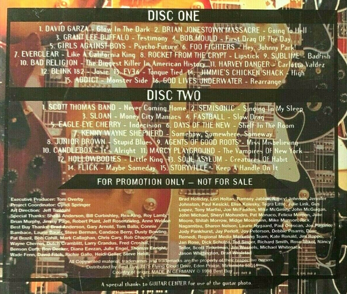 DISC ONE I. DAVID GARZA - Glow In The Dark 2. BRIAN JONESTOWN MASSACRE - Going Tu IleII 3. GRANT LEE BUFFALO - Testimony 4. BOB MOULD - First Drag OF The Day 5. GIRLS AGAINST BOYS - Psycho-Future 6. FOO FIGHTERS - Hey, Johnny Park! 7. BERCLEAR -like A California King 8. ROCKET FROM THE CRYPT - Lipstick 9. SUBLIME - 13adf,-.t, 10. BAD RELIGION -'The Biggest KillerAmerican History_11. HARVEY DANGER - Carlotta \old, 12. BLINK 182 - Joie 13. [136 - TOngue Tied4;;FIIMMIE'S CHICKEN SHACK - High 15 ADDICW1lonster Side 16..G00 LIVESAINDERWATER - Rearrange DISC TWO TT THOMAS BAND --N ter Corning Home 2. SEMISONIC - Singing In My Sle 3. SLOAN - Money City Maniacs 4. FASTBALL - Slow Drag 5..---EAGLE-EYE CHERRY - Indecision 6. DAYS OF THE NEW - Shelf In The 7. KENNY WAYNE SHEPHERD - Somehow. Somewhere, So eway (S. JUNIOR BROI\ N - Stupid 9. AGENTS OF GOOD ROOTS - Mi belie 10. CODLEBOX - It's Alright 11. IMCY PLAYGROUND - The Vampi yOf Ne HOLLOWBODIES - Little King 13. SOUL ASYLUM - Creatu ' Habi 14. FLICK - Ma be Someda 15. STORYAILLE - Keep A Handle On It