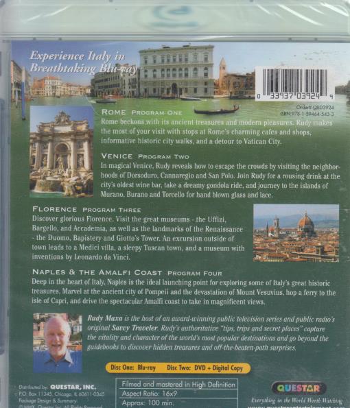 Rudy Maxa's spectacular tour of Italy in Blu-ray plus DVD Combo. Program 1: Rome beckons with its ancient treasures and modern pleasures, Enjoy charming cafes, shops, informative city walks, and a detour to Vatican City. Program 2: Venice. Stroll the neighborhoods of Dorsoduro, Cannaregio and San Polo. Take a dreamy gondola ride, and journey to the islands of Murano, Burano and Torcello for hand blown glass and lace. Program 3: Florence - Tour the great museums of Uffizi, Bargello, and Accademia, as well as the landmarks of the Renaissancethe Duomo, Baptistry and Giotto's Tower. Explore a Medici villa, a sleepy Tuscan town, and a museum with inventions by Leonardo da Vinci. Program 4: Naples and the Amalfi Coast - Here are Italy's great historic treasures. Marvel at the ancient city of Pompeii and the devastation of Mount Vesuvius, hop a ferry to the isle of Capri, and drive along the Amalfi coast.