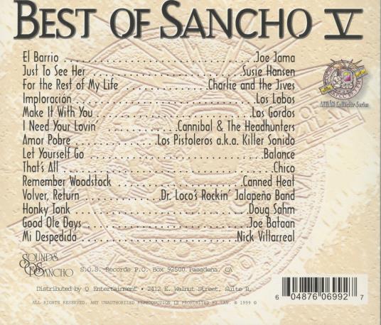 This is the Vol. 5 of the Best of Sancho series. It is full of exceptional musician from the world of Chicano music. Los Lobos bring you one of their finest, Joe Bataan shows off some of that East Coast stuff and Doug Sahm kicks up some Texas blues. In this CD you have everything from Tex Mex to East L.A. oldies and some salsa to keep the party going.Tracklist