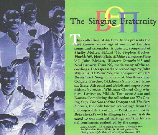 Various acapella groups of the Beta Theta Pi - The Singing Fraternity. Over 75 minutes on 44 tracks. They are: