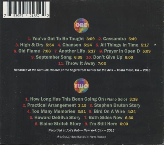 Betty Buckley is a celebrated Broadway star and vocalist known for her expressive storytelling and theatrical delivery. This release captures intimate live performances that blend songs with spoken stories and personal reflections. The material ranges from classic standards to contemporary songs presented in a cabaret-style format. The recordings showcase Buckley’s dramatic interpretation and warm, nuanced vocal performances.