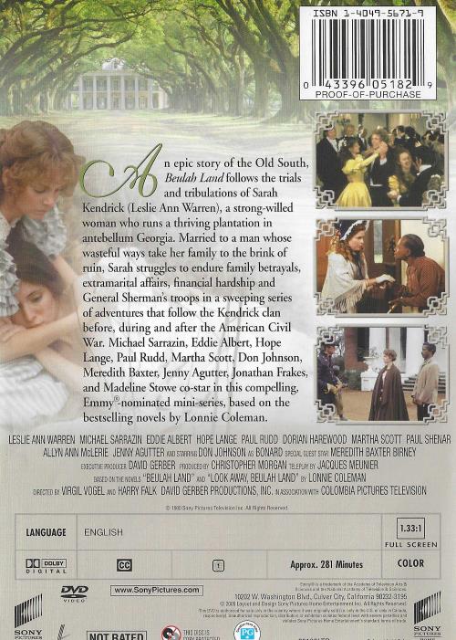 Leslie Ann Warren Michael Sarrazin n epic story of the Old South, /7 Beulah Land follows the trials L.,/ and tribulations of Sarah riff Kendrick (Leslie Ann Warren), a strong-willed woman who runs a thriving plantation in r antebellum Georgia. Married to a man whose r— wasteful ways take her family to the brink of ruin, Sarah struggles to endure family betrayals, extramarital affairs, financial hardship and General Sherman's troops in a sweeping series of adventures that follow the Kendrick clan before, during and after the American Civil War. Michael Sarrazin, Eddie Albert, Hope Lange, Paul Rudd, Martha Scott, Don Johnson, Meredith Baxter, Jenny Agutter, Jonathan Frakes, and Madeline Stowe co-star in this compelling, Emmya-nominated mini-series, based on the bestselling novels by Lonnie Coleman.