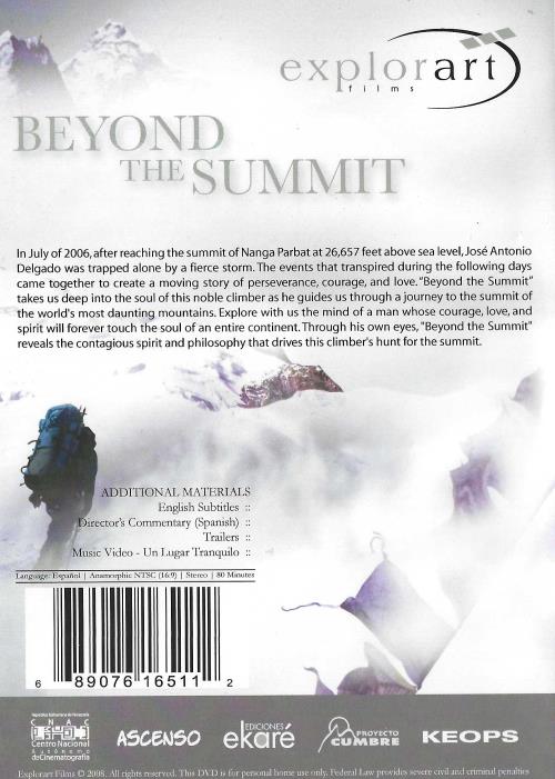In July of 2006, after reaching the summit of Nanga Parbat at 26,657 feet above sea level, José Antonio Delgado was trapped alone by a fierce storm. The events that transpired during the following days came together to create a moving story of perseverance, courage, and love. “Beyond the Summit” takes us deep into the soul of this noble climber as he guides us through a journey to the summit of the world's most daunting mountains. Explore with us the mind of a man whose courage, love, and spirit will forever touch the soul of an entire continent. Through his own eyes, "Beyond the Summit" reveals the contagious spirit and philosophy that drives this climber's hunt for the summit. --- This dvd is optimized for English speaking audiences in that the dvd materials and the on-screen titles and captions are in English. However, the original dialog is in Spanish with English subtitles.