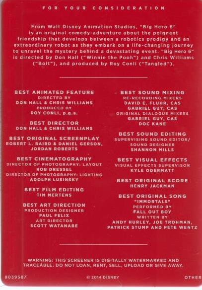 Big Hero 6 Awards Screener DVD VIDEO MOVIE Walt Disney For Consideration FYC
