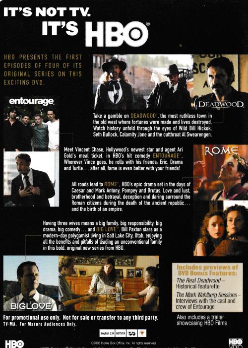Includes the pilot of each of these shows Big Love, Rome, Deadwood, Entourage.