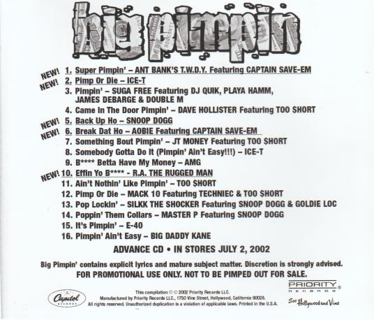 Big Pimpin PROMO w/ Artwork MUSIC AUDIO CD Snoop Suga Free DJ Quik Too Short RAP