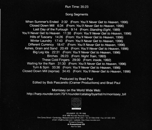 Run Time: 35:23 Song Segments When Summer's Ended 2:32 (From: You'll Never Get to Heaven, 1996) Closed Down Mill 6:34 (From: You'll Never Get to Heaven, 1996) Last Day of the Furlough 9:14 (From: Standing Eight, 1989) You'll Never Get to Heaven 11:30 (From: You'll Never Get to Heaven, 1996) Hills of Tuscany 14:26 (From: You'll Never Get to Heaven, 1996) Winter Laundry 17:43 (From: You'll Never Get to Heaven, 1996) Different Currency 18:47 (From: You'll Never Get to Heaven, 1996) Ashes, Grain and Sand 20:49 (From: You'll Never Get to Heaven, 1996) Big Leg Ida 22:31 (From: You'll Never Get to Heaven, 1996) Birches 26:23 (From: Night Train, 1993) These Cold Fingers 29:00 (From: Inside, 1992) Waiting for the Rain 31:30 (From: You'll Never Get to Heaven, 1996) Turn & Spin 33:36 (From: You'll Never Get to Heaven, 1996) Closed Down Mill (reprise) 34:45 (From: You'll Never Get to Heaven, 1996)