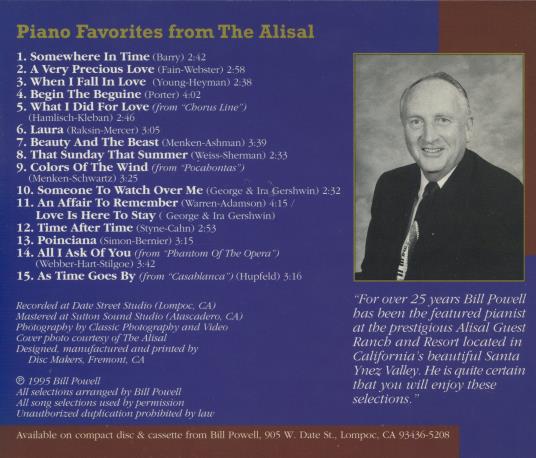 Bill Powell has been the featured pianist at the prestigious Alisal Guest Ranch and Resort in California's beautiful Santa Ynez Valley for over 25 years. Recorded at Date Street Studio (Lompoc, CA). Mastered at Sutton Sound Studio (Atascadero, CA). Photography by Classic Photography and Video. Cover photo courtesy of The Alisal. Designed, manufactured and printed by Disc Makers, Fremont, CA