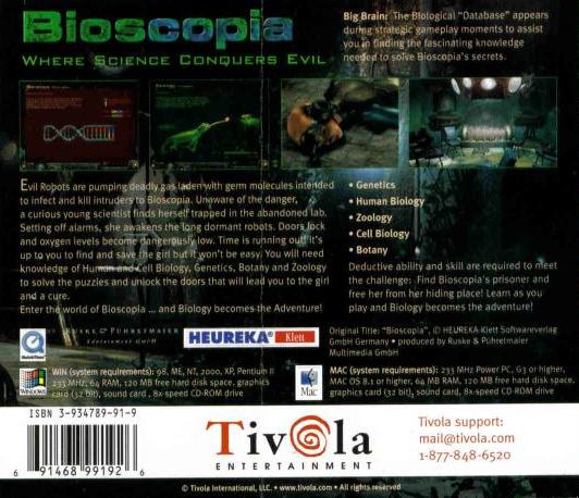 Bioscopia is an educational program from the makers of Physicus and Chemicus. A young research assistant enters a world where robots pump poisonous gasses into the laboratory and a series of puzzles must be solved before time expires. Knowledge of biology is essential, and players will learn and be tested on human biology, cell biology, genetics, botany, and zoology.