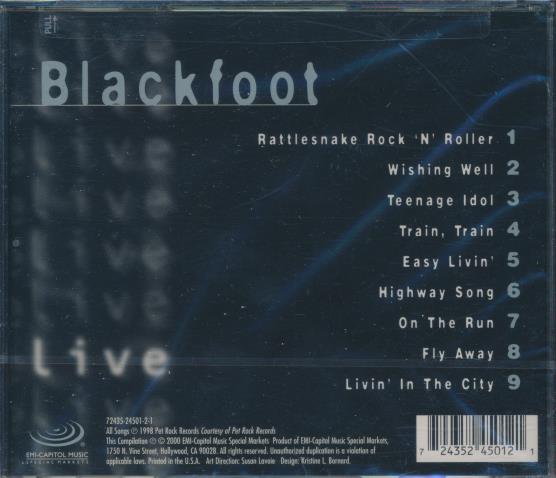 Blackfoot is an American Southern rock band captured here on a live compilation. This release collects energetic live performances of signature tracks including Train, Train; Highway Song; and Teenage Idol. The set highlights driving guitar work, tight rhythms, and gritty vocals that define the band's sound. The compilation was issued by EMI-Capitol Music Special Markets with songs originally released by Pet Rock Records.