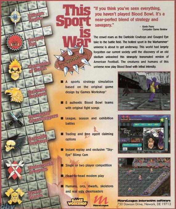 This computer adaptation of Games Workshop's board game brings a fictitious and violent sport to life. The Champions of Death, The Underworld Creepers and The Elfheim Eagles are among the tough sides contesting single matches or a full league.
