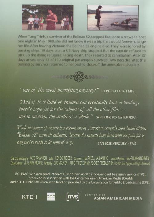 When Tung Trinh — one of the survivors of the Bolinao 52 — climbed aboard an overcrowded boat one night in May 1988, she could not have imagined the trip would reshape the rest of her life. Shortly after departing Vietnam the vessel’s engine failed and passing ships ignored the desperate passengers. Nineteen days later a U.S. Navy vessel arrived nearby, but its captain declined to take aboard the bodies and dying refugees. Confronted with starvation and death, the people on board turned to cannibalism. After 37 days adrift, only 52 of the original 110 people remained alive. Twenty years on, Tung Trinh returned to face what had happened and to seek resolution for long-open wounds.