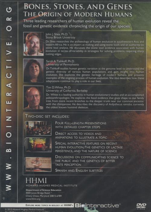Leading scientists John Shea of Stony Brook University, Sarah Tishkoff of the University of Pennsylvania, and Tim White of the University of California, Berkeley, guide us on a global exploration spanning millions of years to illuminate the rise of modern humans. This DVD set includes detailed chapter search by scientific topic; direct access to animations; English and Spanish subtitles; interviews with the speakers; special features on recent human evolution, the genetics of lactase persistence, and the nature of science; and discussions on science journalism and the genetics of bitter taste perception. Presented at HHMI's 2011 Holiday Lectures on Science. Two discs, lecture time approx. 240 min.