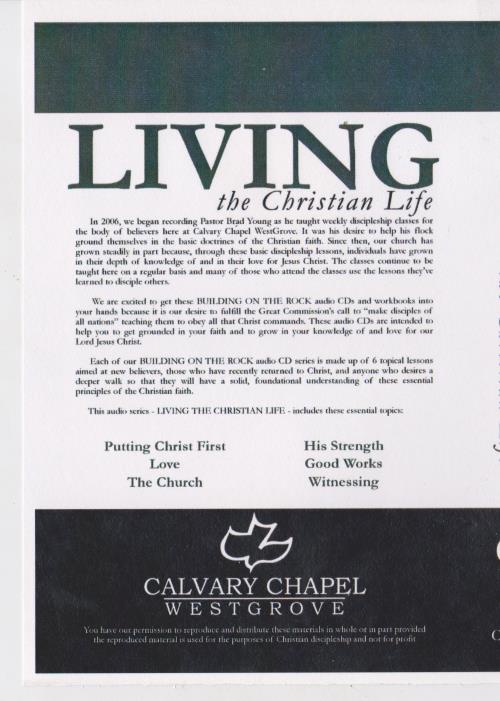 Building On The Rock: Knowing His PeaceIn 2006 we began recording Pastor Brad Young as he taught weekly discipleship classes kw the body of believers hire at Calvary Chapel ViesKirove It was his desire to help his flock ground themselves in the KM: doctrines of rite Christian faith. Since then. our church has grown steadily in part because, through these basic discipleship lessons, individuals have grown in their depth of knowledge of and in their love for Jesus Christ. The classes to be taught here on a regular basis and many of those who attend the classes use the lessons they've learned to disciple others.