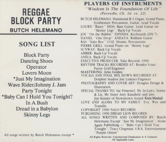 Butch Helemano is a vocalist and multi-instrumentalist who leads the Players of Instruments. The music on this release is rooted in classic reggae rhythms with strong Hammond organ and melodic guitar work. The album balances upbeat party tracks with conscious roots material and lovers style songs. Released in 1990, it features the popular Wave Rider single alongside several original compositions.