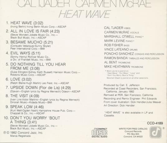 Cal Tjader & Carmen McRae: Heat Wave MUSIC AUDIO CD latin jazz duo! 1982 Concord