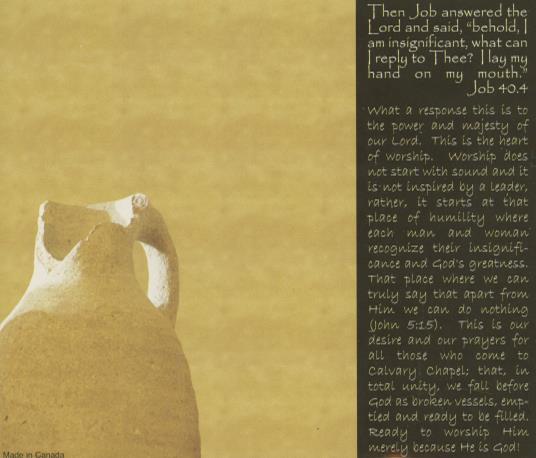 What a response this is to the power and majesty of our Lord. This is the heart of worship. Worship does not start with sound and is not inspired by a leader, rather, it starts at that place of humility where each man and woman recognize their insignificance and God's greatness. That place where we can truly say that apart from Him we can do nothing. (John 5:15). This is our desire and our prayer for all those who come to Calvary Chapel; that in total unity, we fall before God as broken vessels, emptied and ready to be filled. Ready to worship Him merely because He is God.