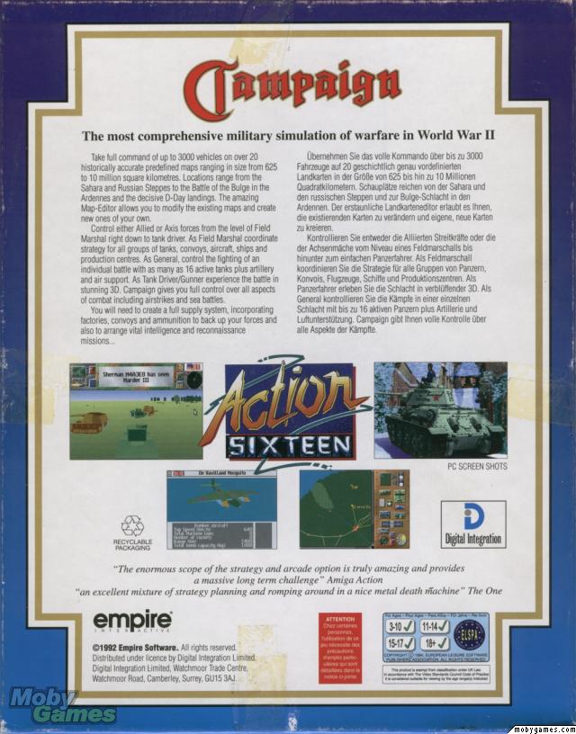 Campaign covers some of the most important battles of the Second World War, from Sahara to the Russian campaign, and from the Battle of the Bulge to D-Day. A map editor allowing users to modify existing scenarios or to create new ones is included. You can take involvement at many levels of a battle. You can take direct control of either driving or gunning a tank, direct groups of 16 tanks and their support units, and create a combined overall strategy factoring in supply routes. Over 150 different vehicles from both sides are featured. It's a hard-core wargame that will like mostly to the "aficionados" of the genre.