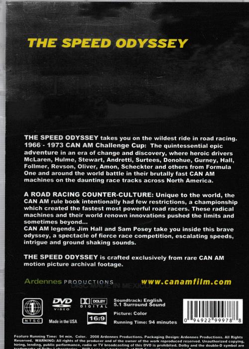 CAN AM THE SPEED ODYSSEY takes you on the wildest ride in road racing. 1966 - 1973 CAN AM Challenge Cup: The quintessential epic adventure in an era of change and discovery where heroic star drivers McLaren, Hulme, Stewart, Andretti, Surtees, Donohue, Gurney, Hall, Follmer, Revson, Oliver, Scheckter and others from Formula One and around the world revel in their brutally fast CAN AM machines, battling on the daunting race tracks across the USA and Canada.