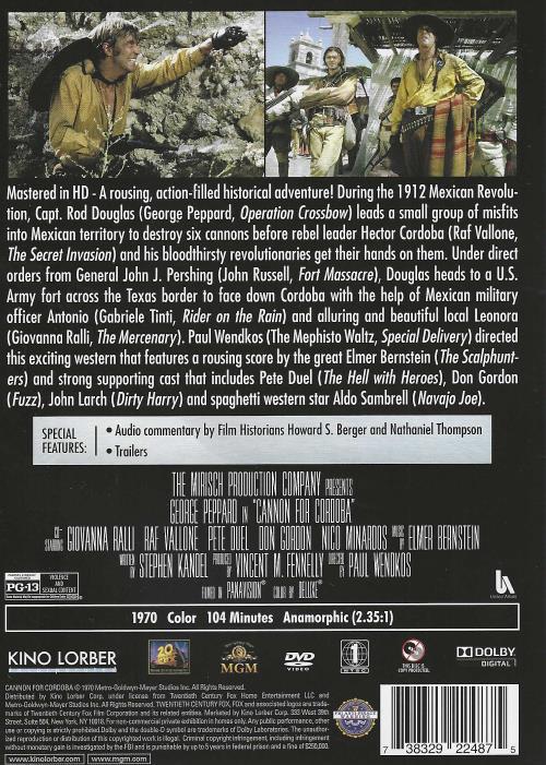 A rousing, action-filled historical adventure! During the 1912 Mexican Revolution, Capt. Rod Douglas (George Peppard, Operation Crossbow) leads a small group of misfits into Mexican territory to destroy six cannons before rebel leader Hector Cordoba (Raf Vallone, The Secret Invasion) and his bloodthirsty revolutionaries get their hands on them. Under direct orders from General John J. Pershing (John Russell, Fort Massacre), Douglas heads to a U.S. Army fort across the Texas border to face down Cordoba with the help of Mexican military officer Antonio (Gabriele Tinti, Rider on the Rain) and alluring and beautiful local Leonora (Giovanna Ralli, The Mercenary). Paul Wendkos (The Mephisto Waltz, Special Delivery) directed this exciting western that features a rousing score by the great Elmer Bernstein (The Scalphunters) and strong supporting cast that includes Pete Duel (The Hell with Heroes), Don Gordon (Fuzz), John Larch (Dirty Harry) and spaghetti western star Aldo Sambrell (Navajo Joe).