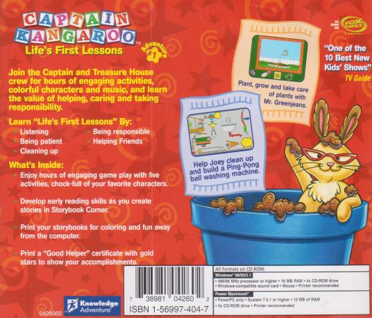On a treasure hunt with Captain Kangaroo, children find out how much fun helping a friend can be. Discover hidden objects, learn the responsibilities of taking care of pets and plants and be treated to Captain Kangaroo's story. Based on an all new version of the classic television show preschoolers and their parents know and love, the animated Captain Kangaroo Life's First Lessons features the Captain, Mr. Greenjeans, Bunny Rabbit, Mister Moose, and other memorable characters as they take kids ages 3 to 5 on delightful adventures that build important social and behavioral skills. Each interactive CD ROM emphasizes strong values and many other attributes that insure success and happiness later in life.