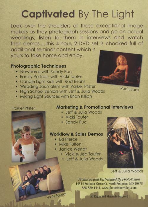 Step into the world of exceptional photography with this comprehensive 4-hour, 2-DVD set. "Captivated By The Light" allows you to look over the shoulders of leading image makers as they capture stunning moments during sessions and actual weddings. The set includes interviews, demos, and additional seminar content that you can take home and enjoy.