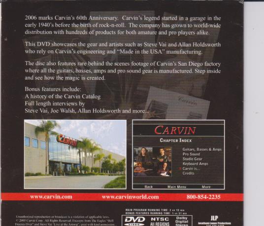 Carvin: 60 Years In The Making2006 marks Carvin's 60th Anniversary. Carvin's legend started in a garage in the early 1940's before the birth of rock-n-roll. The company has grown to world-wide distribution with hundreds of products for both amature and pro players alike. This DVD showcases the gear and artists such as Steve Vai and Allan Holdsworth who rely on Carvin's engineering and "Made in the USA" manufacturing. The disc also features rare behind the scenes footage of Carvin's San Diego factory where all the guitars, basses, amps and pro sound gear is manufactured. Step inside and see how the magic is:created. Bonus features include: A history of the Carvin Catalog Full length interviews by Steve Vai, Joe Walsh, Allan Holdsworth and more...