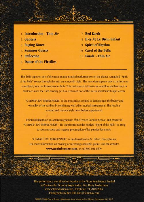 Introduction - Thin Air 2 Genesis 3. Raging Water. Summer Guests 5 Reflection 6 Dance of the Fireflies 7. Red Earth s. 11 es Ne Le Divin Enfant 9. Spirit of Rhythm to. Carol of the Bells ii, Finale - Thin Air This DVD captures one of the most unique musical performances on the planet. A masked "Spirit of the Bells" comes through the mist on a moonlit night. The musician appears only to perform on a medieval, four ton instrument of bells. This instrument is known as a carillon and has been in existence since the 15th century, yet has remained one of the music world's best-kept secrets. "CAST IN BRONZE" is the musical act created to demonstrate the beauty and versatility of the carillon by combining with other musical instruments. The result is a sound and musical style never before experienced.