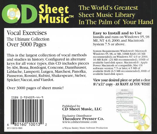 The World's Greatest Sheet Music Library a# MAC In The Palm of Your Hand Vocal Exercises The Ultimate Collection Over 3000 Pages This is the largest collection of vocal methods and studies in history. Configured in alternate keys for all voice types, this CD includes pieces by Abt, Bona, Bordogni, Concone, Dannhauser, Lablache, Lamperti, Lutgen, Marchesi, Panofka, Panseron, Rossini, Rubini, Shakespeare, Sieber, Spicker, Vaccai, and Viardot. Over 3000 pages of sheet music!
