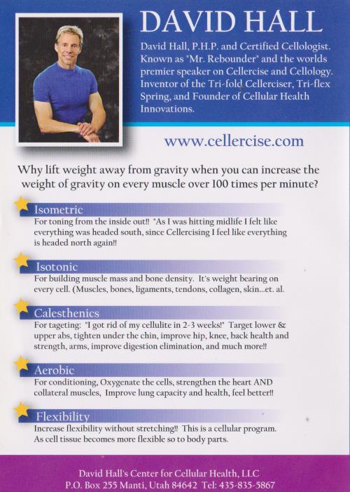 David Hall's Professional Cellerciser Full Body Instructional DVD David Hall, P.H.P. and Certified Cellologist. Known as "Mr. Rebounder" and the worlds premier speaker on Cellercise and Cellology. Inventor of the Tri-fold Cellerciser, Tri-flex Spring, and Founder of Cellular Health Innovations.