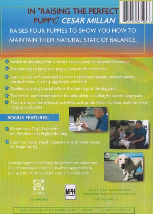 In "Raising the Perfect Puppy," Cesar raises four puppies to show you how to maintain their natural state of balance. Everybody dreams of having a perfect dog - one that is happy, healthy, well-balanced, and socializes well with other animals and people. Cesar shows you how to make this dream a reality.
