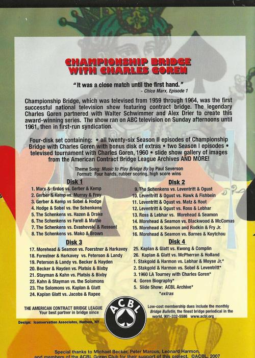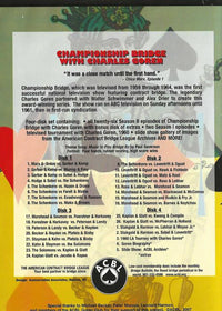 Bridge Champ, which was televised from 1959 through 1964, was the first successful national tv show featuring contract bridge. The legendary Charles partnered with Walter and Alex to create this award-winning show. The show ran on ABC television on Sunday afternoons until 1961, then in first-run syndication.