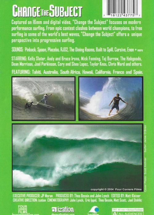 Captured on 16MM and digital video, Change the Subject focuses on modern performance surfing, from epic contest clashes between world champions, to free surfing in some of the world's best waves... Featuring Tahiti, Australia, South Africa, Hawaii, California, Spain and France. With Kelly Slater, Andy & Bruce Irons, Mick Fanning, Dean Morrison, Cory & Shea Lopez, and more. Music by Pinback, Built to Spill, Cursive, and more.