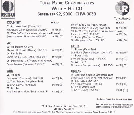 Chartbreakers Weekly Hit: TotalRadio: September 22, 2000 CHW-0038 Promo w/ Artwork