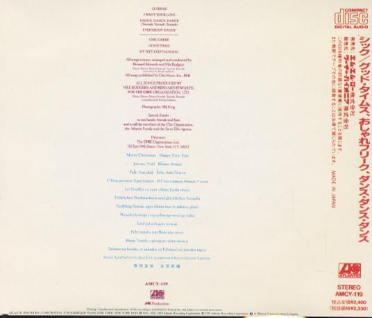 Chic is a legendary American band known for their influential disco and funk sound that helped define the late 1970s and early 1980s dance music scene. This compilation album features Chic's greatest hits, including 'Le Freak', 'Dance, Dance, Dance (Yowsah, Yowsah, Yowsah)', and 'Everybody Dance'. The release was pressed for the Japanese market with additional Japanese text and sleeve notes.
