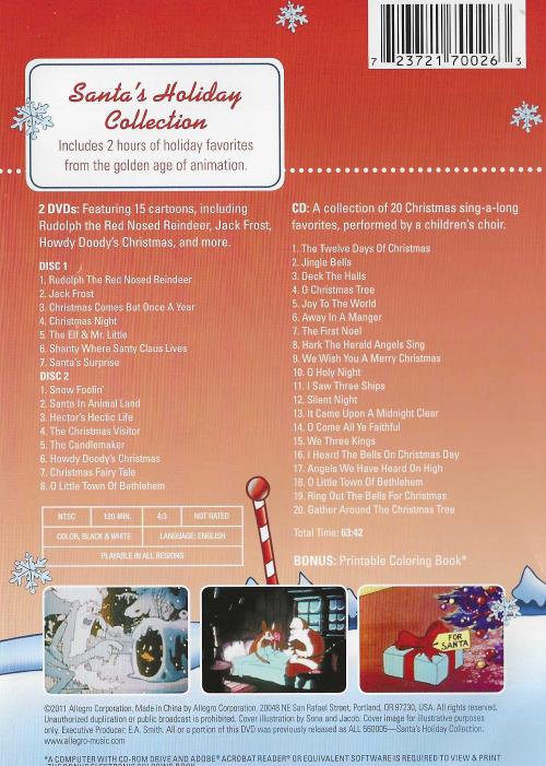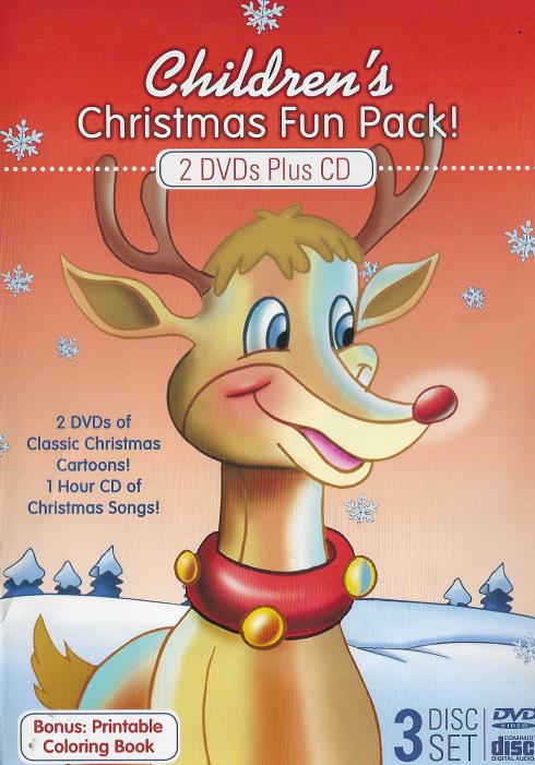 Includes 2 hours of holiday favorites from the golden age of animation. additeolf4 Christmas Fun Pack! -?/ 2 DVDs: Featuring 15 cartoons, including Rudolph the Red Nosed Reindeer, Jack Frost, Howdy Doody's Christmas, and more. DISC 1 ; 1. Rudolph The Red Nosed Reindeer 2. Jack Frost 3. Christmas Comes But Once A Year 4. Christmas Night 5. The Elf & Mr. Little 6. Shanty Where Santy Claus Lives 7. Santa's Surprise DISC 2 1. Snow Foolin' 2. Santa In Animal Land 3. Hector's Hectic Life 4. The Christmas Visitor 5. The Candlemaker 6. Howdy Doody's Christmas 7. Christmas Fairy Tale 8 0 Little T 2 DVDs Plus CD CD: A collection of 20 Christmas sing-a-long favorites, performed by a children's choir. 1. The Twelve Days Of Christmas 2. Jingle Bells 3. Deck The Halls 4.0 Christmas Tree 5. Joy To The World 6. Away In A Manger 7. The First Noel 8. Hark The Herald Angels Sing 9. We Wish You A Merry Christmas 10.0 Holy Night 11.1 Saw Three Ships 12. Silent Night 13. It Came Upon A Midnight Clear 14. 0 Come All Ye Faithful 15.We Three Kings 16.1 Heard The Bells On Christmas Day 17. Angels We Have Heard On High 18.0 Little Town Of Bethlehem 19. Ring Out The Bells For Christmas 20. Gather Around The Christmas Tree 2 DVDs of Classic Christmas Cartoons! 1 Hour CD of Christmas Songs! otal Time: 63:42 US: Printable Colorin •