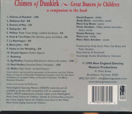 Chimes of Dunkirk is an ensemble that performs traditional dance music arranged for children and community dance events. Their recordings feature fiddles, accordion, piano and bass, presenting lively old-time, folk and dance tunes. This companion recording to the book Great Dances for Children provides clear arrangements and tempos ideal for teaching and leading group dances. The music is energetic, accessible and rooted in traditional New England and Celtic dance styles.