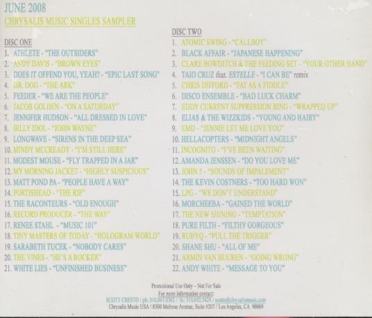 June 2008 Chrysalis Music Singles Sampler. Promotional CD compiled for industry use.