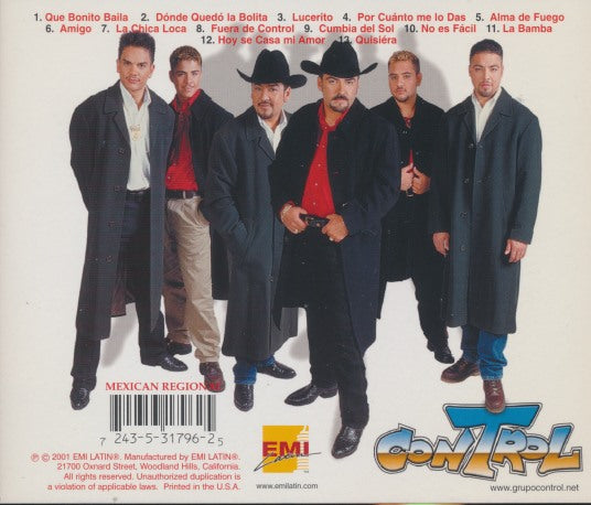 Control (also known as Grupo Control) are a Mexican regional ensemble known for lively norteño and cumbia-infused arrangements. Their album 'Fuera de Control' blends danceable cumbias with romantic ballads and traditional accordion-led textures. The group often presents a classic norteño image and delivers energetic performances tuned for both dance floors and radio. This EMI Latin release highlights their mix of up-tempo tracks and sentimental numbers.