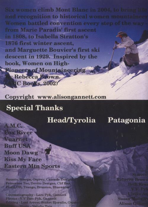Six women climb Mont Blanc in 2004, to recognize the role of women in mountaineering. Women battled convention every step of the way - from Marie Paradis' first ascent in 1808, to Isabella Stratton's 1876 first winter ascent, and Marguette Bouvier's first ski descent in 1929. Inspired by the book, AMC's Women on High-Pioneers of Mountaineering by Rebecca Brown. Alison Gannett, France/USA, 15 mins. 2004